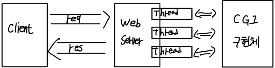 - 같은 요청에도 프로세스를 생성해서 처리하는 구조는 상당한 비효율성을 낳았다.