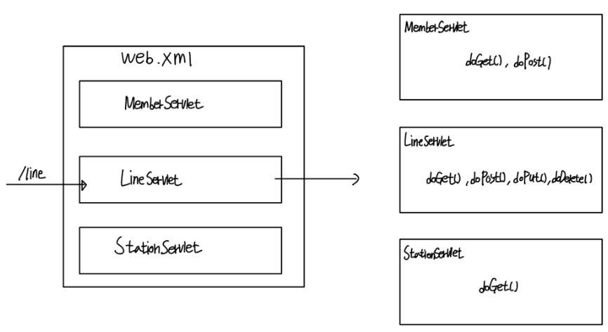 - /line 이라는 request가 오면 LineServlet의 각각 Http Method에 맞는 Method를 불러주게 된다.