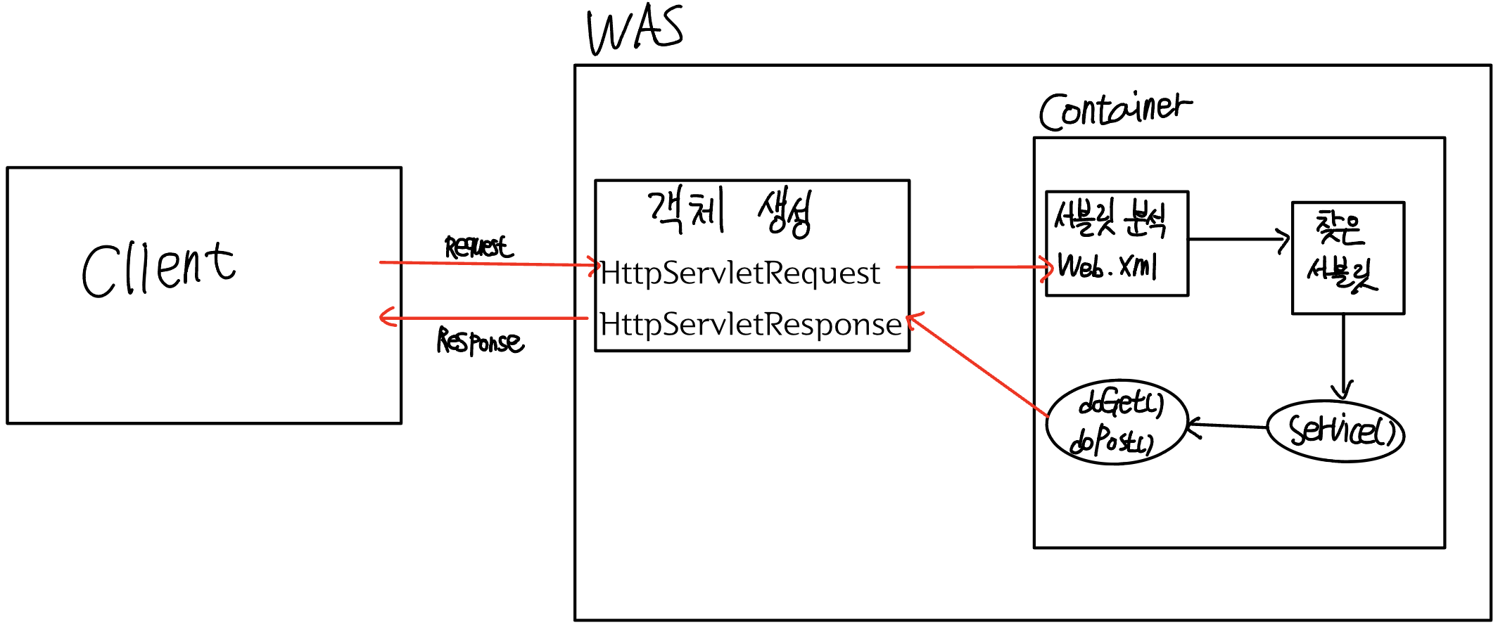 -> WAS는 HttpServletRequest 객체를 생성하여 저장